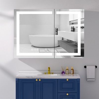 HBEZON Medicine Cabinet with Mirrors and Lights, 36'' x 30'' Wall Mount Lighted Bathroom Cabinet, Defogger, Dimmable, Aluminum, Double Door, Silver