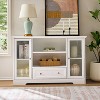 - The cabinet offers ample storage space with two glass-paneled doors, two open shelves, and a spacious central drawer for versatile organization.