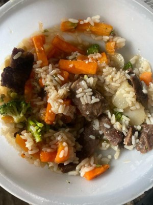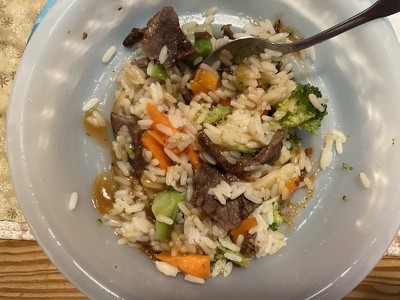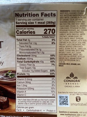 cooked rice (water, white rice), seasoned cooked beef-water and binder product (beef, water, contains 2% or less of: caramel color, dextrose, seasoning |natural flavor, salt, maltodextrin, dried whey, dried cauliflower, sesame oil], modified corn starch, potassium chloride, potassium phosphate, salt, sodium phosphates, spice extractives), carrots, water, broccoli, water chestnuts, brown sugar, soy sauce (water, wheat, soybeans, salt, alcohol, vinegar, lactic acid), contains 2% or less of: scallions, pineapple juice concentrate, rice vinegar, modified corn starch, garlic, sesame seed oil, canola oil, onions, cooking wine (white wine, natural flavor, salt), sugar, chardonnay wine, ginger, chili paste (red chili peppers, distilled vinegar, salt), ground cochin ginger, butter (cream, salt), olive oil