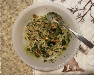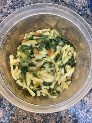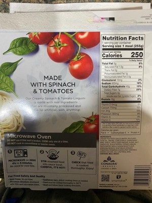 The photo on the package is very misleading. The pieces of linguini are about an inch long, the tomatoes are scraps, the spinach and sauce is like porridge and tasteless. It looks very unappealing and tastes terrible. I should have known- it was on sale and I bought two boxes. Very unusual for me, I’ve thrown the second box away.