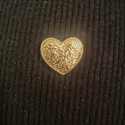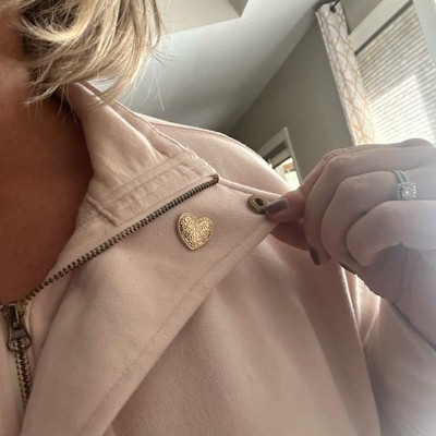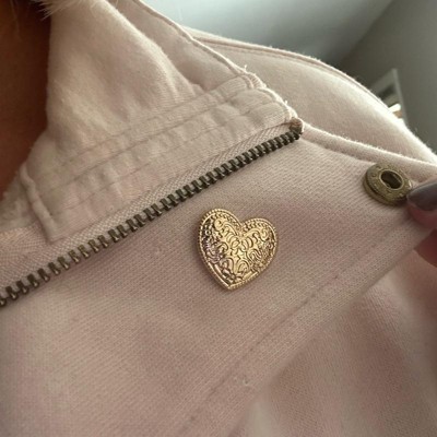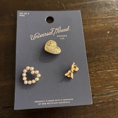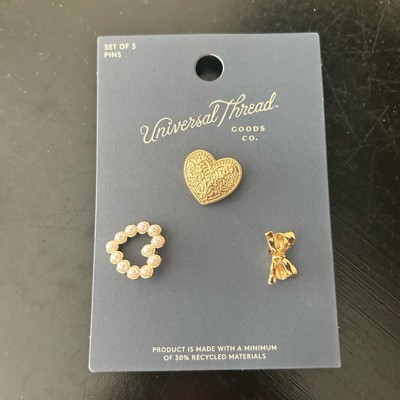 Make a stylish statement on any occasion with this 3-Piece Heart and Bow Pin Set from Universal Thread™. Designed in a gold hue for a lustrous finish, the set includes a faux-pearl heart, hammered heart and bow-tie pin for a glam and graceful look. Made with nickel-free metal to suit most skin types, this pin set features postback closures for secure attachment.