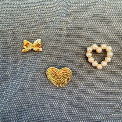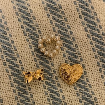 [This review was collected as part of a promotion.] This is a sweet little three piece brooch set. It has one pin that's a small heart shape made from little pearls, one pin that's a little larger heart shape with lots of intricate detail done in a golden tone and the last pin is a sweet little golden toned bow. These are small pins so they're adorable to wear individually or you can cluster them and wear together. Nice secure backings on them. Love them! I received an incentive to write this review.
