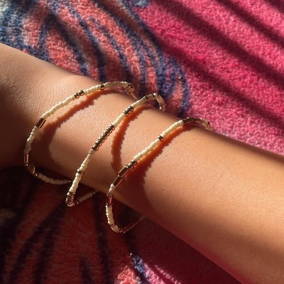 Accessorize your wrist with the statement style of this 7-Piece Heart Beaded Bracelet Set from Universal Thread™. This set of seven bracelets features ivory and gold beading in round and square shapes with multiple heart accents for simply stunning style, making them great for gifting or adding to your own collection. Featuring a pull-on design for ease of wear, this beaded bracelets in the set can be worn individually or together for a variety of standout looks.