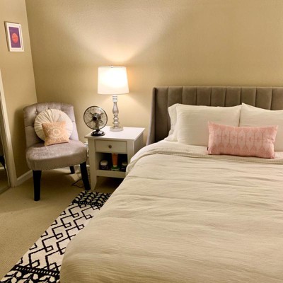 I Originally was going to return this because I thought it would be more muted blush/coral/teracotta color and it is a vivid bright blush/coral. I tried to return it but there literally was no way. I had the barcode printed from the site I went to the store everything. So beware you CANNOT return this item. So I took it home. It turned out 6 months later I changed up my bedroom and it became the perfect accent for my all white bedding!! Now I’m completely in love with it. It’s a kind of thick, odd material I can’t describe and the pattern is printed on but it is actually quite durable and doesn’t hold dust at all. Anyway there were no reviews so thought I’d put in my two cents. It’s summery and fun!