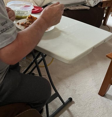 [This review was collected as part of a promotion.] This is pretty small, you definitely can’t spread things out on it, but it is a good little folding table for a laptop or to put drinks on at a party. Easy to store and move around, but the top doesn’t attach to the stand securely, so you do have to be careful not to put too much weight on one side or the other. It’s useful for small spaces!
