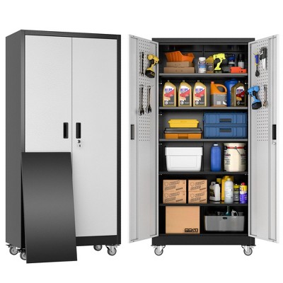 Elevate your storage game with this heavy-duty metal garage cabinet, engineered to withstand rigorous daily use in any demanding workspace. The reinforced steel construction and scratch-resistant finish ensure long-lasting strength, while four smooth-rolling wheels make maneuvering a breeze. Organize everything from tools to large equipment with two fully adjustable shelves and a versatile integrated pegboard door for vertical storage. Quick-lock casters secure the unit in place, and an intuitive assembly process gets your cabinet ready for action right away.