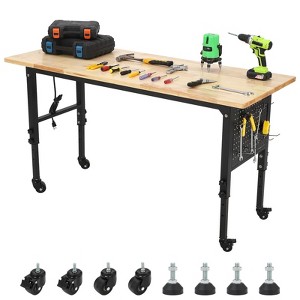 48x24 Inch Heavy Duty Workbench with Power Outlets, Adjustable Height Work Table with Locking Wheels, 2000 lb Capacity for Garage and Workshop?Product Description:Engineer the ultimate workspace with this professional 48x24 inch heavy-duty workbench, designed to handle demanding projects with exceptional strength and versatility. Supporting an impressive 2000-pound capacity, this work table combines an industrial-grade H-steel frame with a warp-resistant rubberwood top that provides 20% more surface area than standard models. The innovative dual-mode mobility system features four locking casters for easy movement and adjustable non-slip feet for rock-solid stability on uneven floors. With five tool-free height adjustments (28"-38"), integrated power hub (4 outlets + 2 USB ports), and organizational pegboard with hooks, this workbench delivers professional performance for garages, workshops, offices, and commercial environments.?Key Features:1. Industrial 2000 lb Load CapacityConfidently handle heavy machinery and equipment with the industrial-grade H-steel frame and warp-resistant rubberwood top. The robust construction provides 20% more workspace than standard benches, making it ideal for automotive repair, woodworking, and large-scale projects.2. Tool-Free Five-Position Height AdjustmentSwitch seamlessly between seated and standing work with five preset height levels from 28 to 38 inches. The innovative tool-free adjustment system reduces back strain and adapts to various tasks without interrupting your workflow.3. Dual-Mode Mobility & Stability SystemChoose between effortless mobility with four locking casters (two with brakes) or permanent stability with adjustable non-slip feet. This versatile system accommodates both temporary workshop setups and fixed installations on uneven garage floors.4. Integrated Power Hub & OrganizationPower all your tools and devices with four AC outlets and two USB charging ports. The included pegboard and tool hooks keep wrenches, saws, and cords organized and within easy reach, eliminating workspace clutter.5. Quick Assembly & Multi-Space VersatilityEnjoy straightforward setup with pre-drilled holes and labeled hardware. The versatile design serves equally well as a computer desk, craft station, automotive workbench, or commercial prep table, adapting to any space requirement.?Specifications:? Dimensions: 48" L x 24" W x 28"-38" H (Adjustable)? Weight Capacity: 2000 lbs? Tabletop Material: Warp-Resistant Rubberwood? Frame: Industrial H-Steel Construction? Power: 4 AC Outlets + 2 USB Ports? Mobility: 4 Locking Casters + Adjustable Non-Slip Feet? Height Settings: 5 Tool-Free Adjustment Positions? Organization: Pegboard with Tool Hooks? Applications: Garage, Workshop, Office, Commercial Space