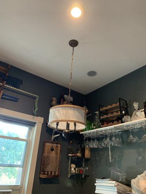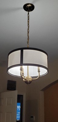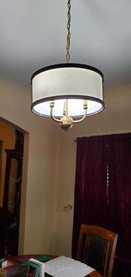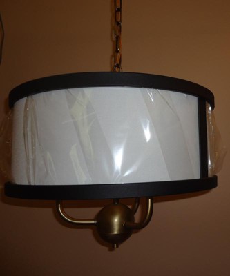 [This review was collected as part of a promotion.] Kichler’s Hettle 3 Light Chandelier is a stylish addition to our den. I have been seeing drum style fixtures and had wanted one for a little while. I installed this fixture to replace a floor lamp that I was a little tired of and did not light the corner seating area as well as I wanted. Installed this fixture looks very nice and the lighting is much better. I was also able to clear the floor space of the lamp. The lighting is really terrific: it brightens the area very well; I can read and do small tasks that require good lighting very comfortably. The multiple finishes on the fixture really make this blend in nicely with our existing décor. The finishes are all flawless. The antique brass and black finishes along with the white fabric shade blend to make the overall design of the fixture look vintage; it impresses as art deco but also classic and sporty. This fixture is really nicely designed and is easy to assemble and install. The quality is very apparent when you have the fixture in hand; it is very durable and nicely made so much so it will clearly have a long life. I usually install fixtures by myself but as this is a hanging fixture it was nice to have an extra pair of hands to hold the fixture while I installed it. I thought it was pretty self-explanatory but this comes with short easy to follow instructions. Everything needed is included except the light bulbs. This takes three candelabra bulbs. I left the plastic on the fabric cover for the moment because I plan to repaint the room from peach to blue which will look great with this fixture. Definitely an eye catcher, everyone immediately notices as being new and attractive. I have gotten a lot of compliments on this.