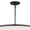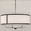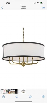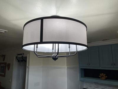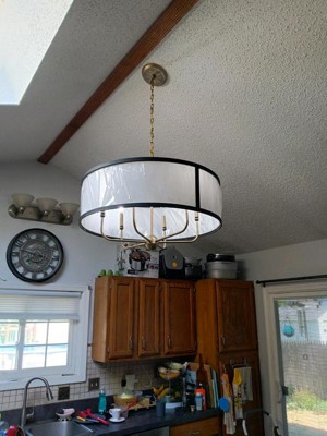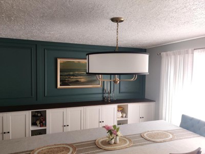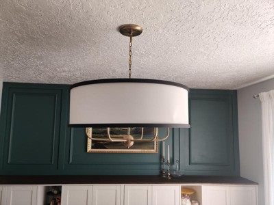 [This review was collected as part of a promotion.] I installed this in my dining room, and it looks really pretty! The contrasting black trim matches well with the white-colored fabric shade and brass metal finish. It gives off a vintage and rustic vibe. The wide, round shape of the shade makes it look spacious, elevating my dining room. I was able to shorten the chain using pliers and install it without much difficulty.