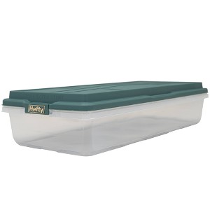 Looking for the perfect storage solution to make organizing the holidays easy? Set apart your holiday decor with the festive Hefty HI-RISE under the bed 63 quart storage bin. This clear container with green lid keeps your items dust-free and dry so you can enjoy them for years to come. Stack with confidence on the recessed lid to save space in your garage, basement or attic. The large, click secure latches allow for secure and comfortable transport. Work to maintain your storage space and organize your household with maximum containment. Store and better protect items to SAVE SPACE and edit your home or business. Check out the complete line of Hefty Holiday storage bins to help create a clean & uniform storage space.