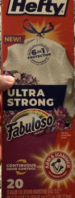 [This review was collected as part of a promotion.] Hefty trash bags with Fabuloso are the trash bags I didn't know I needed but I really did. They smell AMAZING. Love the 13-gallon size, it works well in almost all of my trashcans -- kitchen, bathrooms, bedrooms. Stretchy strong is the perfect way to describe them, and I haven't had a single one leak or break. Loving them so far, highly recommend!