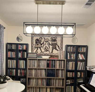Inspired by striking industrial styles, the INK+IVY Helena 6-Light Frosted Glass Globe Linear Chandelier offers a bold vintage update to your dining decor. This rectangular chandelier features an open cage design with 6 glass globe shade that brilliantly illuminate your space. An antique brass rectangular ceiling mount with 2-side downrods complements the transitional look that easily reinvigorates your kitchen or dining room. Uses 6, CFL 13W or LED 9W Type B light bulbs (not included).