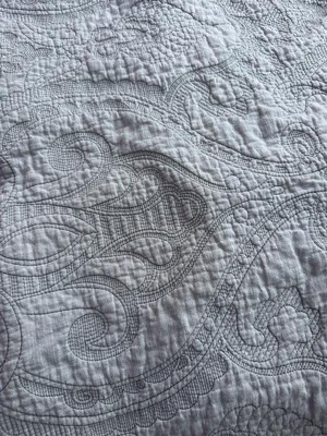 [This review was collected as part of a promotion.] Gorgeous! I love this light green color. The stitching is so pretty. The quilt itself is a nice heavy weight without being too hot. It has a soft feel to the cloth and the quilt itself is very durable. I love the texture- it is a beautiful, detailed pattern without being too overwhelming. This looks fabulous in our bedroom. I absolutely love it!