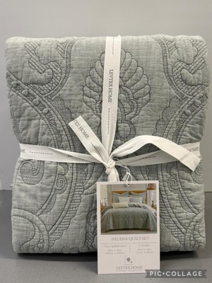 The Levtex Home Helena Sage Quilt Set is 100% cotton front and back. Inspired by timeless European inspired textiles, it features an ornate paisley medallion with scrolling floral motifs, intricately quilted for texture and depth. Presented in a soft sage hue, it creates a serene, classic look. Machine washable for easy care.