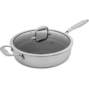 - TRI-CLAD STAINLESS for Quick & Even Heating: Hell’s Kitchen Hybrid Tri-Clad cookware features stainless steel construction with a conductive aluminum core, and a laser-etched flame pattern above a durable nonstick surface.