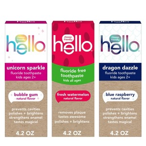 hello Kids' 4.2oz Watermelon Fluroide-Free Toothpaste + 4.2oz Unicorn Sparkle Buble Gum Fluoride Toothpaste + Dragon Dazzle Fluoride Toothpaste