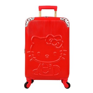 Travel in style with this Hello Kitty 20" carry-on hardside luggage. Featuring a bold red design with an image of Hello Kitty on the front and character print on the top corners, this bag adds charm to your travels. The retractable trolley handle, side handle, and eight smooth-rolling wheels ensure effortless mobility. Interior organization includes cross straps and a fabric-lined divider panel for convenience, plus an expansion zipper for extra storage. Made with durable ABS and PC film, it's easy to wipe clean for simple care.