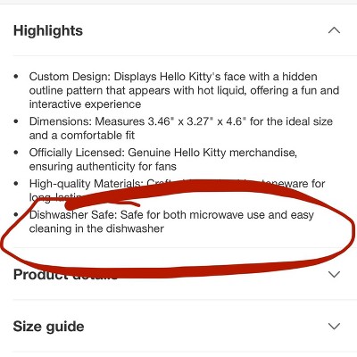 I purchased this mug because my daughter wanted a Hello Kitty mug. I purposely chose this one in particular because Target’s website says it is dishwasher safe. It is NOT dishwasher safe. The mug says “hand wash only” right on it! I never would have purchased this mug if I had known it couldn’t go through the dishwasher. I would return it but my daughter has already unwrapped it and likes the way it looks so now I guess I’m going to be stuck hand washing this mug whenever she wants a hot cocoa.