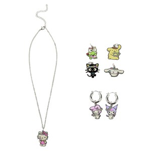 Celebrate your love for Hello Kitty & Friends with this charming 10-piece jewelry set. Featuring a silver necklace, character charms of Chococat, Cinnamoroll, Keroppi, Pom Pom Purin, Kuromi, My Melody, and Hello Kitty, and a stylish pair of hoop earrings, this set is perfect for any fan. Made from durable zinc alloy, the pieces can be easily maintained by wiping them clean with a soft cloth.