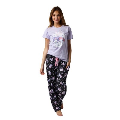 - Custom Design: Includes sleep pants and a button-down short-sleeve t-shirt. Both the top and the pants feature a colorful holiday all-over print of wreaths and Hello Kitty dressed as Santa Claus