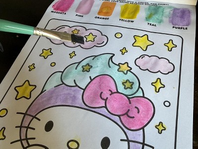 Just add water to create amazing pictures with Bendon’s Hello Kitty Page Palette Paint Books! Simply dip your paintbrush in water, swish it around in the 6-color paint palette at the top of each page, and paint to create a colorful picture. Use the perforated Tear and Share® pages make to remove your page, let it dry, and display! The standard trim size for this coloring book is 7.75 inches by 10.75 inches.