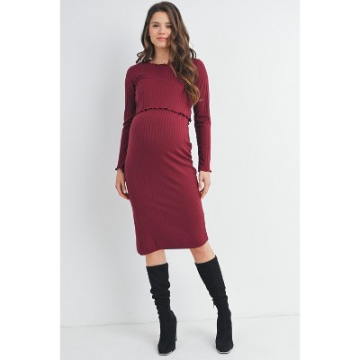 Hello Miz Women's Long Sleeve V Neck Ruched Maternity Velvet Dress - Burgundy - Small