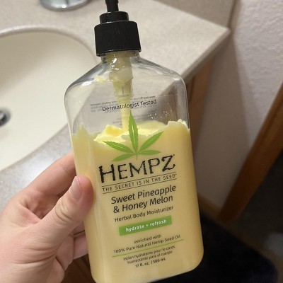 Smell like a vacation with Hempz Sweet Pineapple & Honey Melon Body Moisturizer! This ultra-light, fast-absorbing body lotion keeps your skin irresistibly soft and hydrated. Infused with a juicy blend of Pineapple Extract, Melon Extract, Hemp Seed Oil, and Shea Butter to help moisturize and soften the skin barrier. With succulent notes of juicy melon, fresh pineapple, and ripe mango—this fruity and tropical scent is Vegan, THC-free, Paraben-free, Cruelty-free, and Phthalate-free.