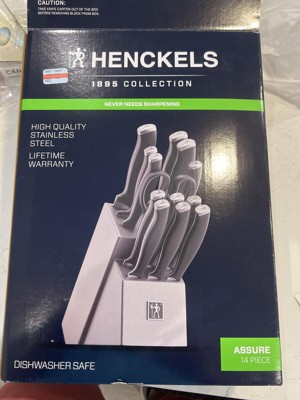 The Assure 14-piece knife block set features a full set of ultra-sharp knives for everyday meal prep. Peel fruit and remove blemishes with the 3-inch paring knife, cut strawberries, mince garlic, and slice cheese with the 6-inch utility knife and cut meat, fish, and vegetables with the Japanese-style santoku knife. This set is complete with 6, 4.5-inch steak knives and is housed in a handsome graphite grey block.HENCKELS Assure knives are fabricated from high-quality stainless steel, perfect for precision cutting. Thanks to their handy micro-serrated edge, the blades never need to be sharpened. Enjoy tireless cutting with the ergonomic handle and the single-piece stamped blade construction that’s both lightweight and balanced. Featuring a stylish, stainless-steel endcap, Assure knives look as good as they feel.