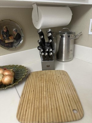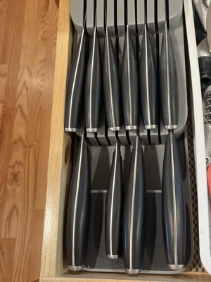 - Set includes: 3-inch paring, 5-inch serrated utility, 5.5-inch santoku, 6-inch utility, 8-inch bread knife, 8-inch chef’s knife, 6 x 4.5-inch steak knives, shears, 13-slot knife block