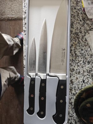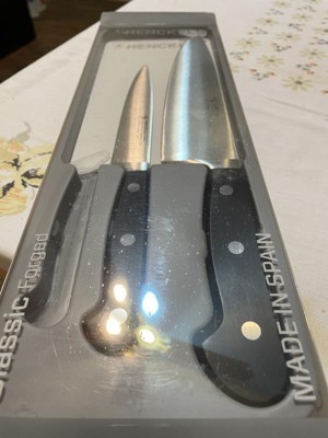 Meal prep is easy with the HENCKELS Classic 3-piece Starter Knife Set. Honed for long-lasting sharpness, the fine-edge blades are perfect for precision cuts. Effortlessly chop herbs with the 8-inch chef's knife, slice cheese with the 6-inch utility knife, and peel apples with the 4-inch paring knife.High-quality German stainless steel strengthens this durable, Spanish-made knife. With a seamless transition from blade to handle, Classic knives' fully forged construction provides balance as the traditional triple-rivet handles encourage tireless cutting. These satin-finished blades are conveniently dishwasher safe.