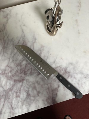 Experience confidence with each cut. The Henckels International CLASSIC Hollow Edge Santoku Knife boasts a precision, fine-edge blade that is honed for long-lasting sharpness. This Santoku - Japanese for "three virtues" - excels at three cutting techniques: expertly mince garlic, slice cucumber, and dice onions with this Asian all-rounder.The hollow edge blade has small indentations, aka grantons, which prevent food from sticking while cutting. High-quality German stainless steel strengthens this durable, Spanish-made knife. With a seamless transition from blade to handle, the knife's fully forged construction provides balance as the traditional triple-rivet handle encourages tireless cutting.Henckels International makes essential kitchen tools every home chef needs. From steak knives to spatulas, every product boasts high quality at an exceptional value. Created in 1895 by Zwilling J.A. Henckels, this value-driven brand guarantees the same durability, design and ease of use for which the global company is known. Equip your kitchen with expertise with Henckels International.