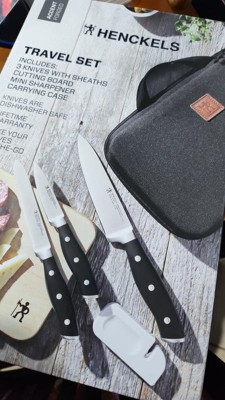 Compact, outdoor-friendly set for taking your knives on-the-go.This 6-piece travel set features an essential assortment of kitchen tools so you can cook like a pro wherever you go. Compact and easy to store, this handy set is a must whether you’re renting a vacation house, sailing the seas, or camping in the great outdoors.This complete set includes three indispensable knives for everyday meal prep, a durable cutting board for safe slicing and stylish serving, and a mini ceramic knife sharpener for maintaining your razor-sharp blades. Housed in a durable hard case bag for on-the-go toting, you can safely store your knives in the mesh knife slots and secure them with the included Velcro straps.Forged Accent knives are made from high-quality German stainless steel, perfect for precision cutting. The forged bolster construction seamlessly transitions from blade to handle for durability and balance. Curved for comfort, the triple-rivet handle features a stylish, stainless-steel endcap that adds aesthetic appeal to your knife block. Stamped with the single man HENCKELS logo, this Halberdier symbolizes Forged Accent's superb quality at a remarkable value. Since 1895, HENCKELS has made superior quality knives designed for effortless prepping.
