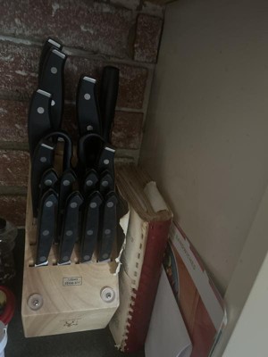 The Henckels International Forged Premio 13-pc Knife Block Set has a knife to handle every kitchen task. Fabricated from high-quality German stainless steel, the fine-edge blades are perfect for precision cuts. The all-rounder 8" Chef's Knife is ideal for chopping herbs and dicing onions while the 5" Serrated Utility Knife cleanly slices through tomatoes. Perfectly peel apples with the small 3" Paring Knife.The forged bolster construction seamlessly transitions from blade to handle for durability and balance. Curved for comfort, the triple-rivet handle features a stylish, stainless steel endcap that adds aesthetic appeal to your knife block. Stamped with the single man Henckels' logo, this Halberdier symbolizes Forged Premio's superb quality at a remarkable value.Henckels International makes essential kitchen tools every home chef needs. From steak knives to spatulas, every product boasts high quality at an exceptional value. Created in 1895 by Zwilling J.A. Henckels, this value-driven brand guarantees the same durability, design and ease of use for which the global company is known. Equip your kitchen with expertise with Henckels International.