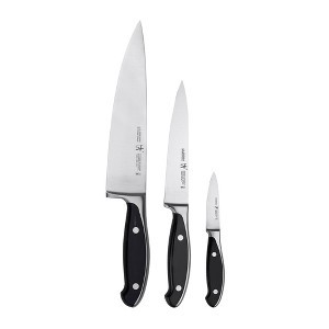 Prepping is easy with the Henckels International Forged Synergy 3-pc Starter Knife Set. Fabricated from high-quality German stainless steel, the fine-edge blades are perfect for precision cuts. The all-rounder 8" Chef's Knife is perfect for chopping herbs and dicing onions while the 5" Utility Knife is ideal for slicing cheese. The 3" Paring Knife is excellent for detailed work - like peeling apples or removing blemishes.The forged bolster construction seamlessly transitions from blade to handle for durability and balance. Designed for comfort and style, the ergonomic double-rivet handle features a sleek, stainless steel backing that looks as good as it feels.Henckels International makes essential kitchen tools every home chef needs. From steak knives to spatulas, every product boasts high quality at an exceptional value. Created in 1895 by Zwilling J.A. Henckels, this value-driven brand guarantees the same durability, design and ease of use for which the global company is known. Equip your kitchen with expertise with Henckels International.