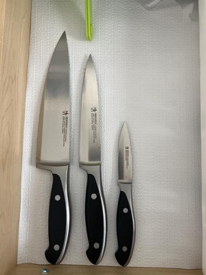 - Set includes 3" paring knife, 6" ultility/sandwich kinfe, and 8" chef's knife.