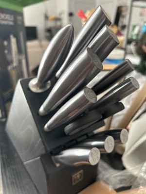 The 13-piece knife block set features all the knives you need to set your kitchen up right. From the 3-inch paring knife for smaller scale jobs, to the all-rounder 8-inch chef’s knife for slicing and dicing, this set contains the key knives for all tasks, along with kitchen shears and 4 ultra-sharp steak knives.Sleek and elegant, the Graphite cutlery line features a fully forged bolster construction that seamlessly transitions from blade to handle for durability, balance, and superior design. Fabricated from high-quality German stainless steel, the satin-finished blade produces precision cuts and is honed for long-lasting sharpness. Contoured for comfort, the smooth handle is designed for fatigue-free cutting. It has a handsome, stainless steel end cap stamped with HENCKELS' single man logo, a Halberdier, who stands for the brand's superior quality at an exceptional value. These dishwasher safe knives in this knife block set make clean up a cinch.