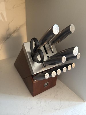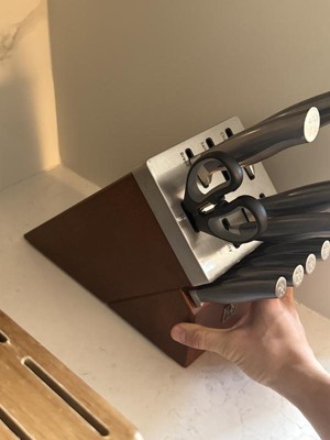 The 14-piece block set features all the knives you need to set your kitchen up right. From the 3-inch paring for smaller scale jobs to the all-rounder 8-inch chef’s knife for slicing and dicing, this set contains the key knives for all tasks, along with kitchen shears and 6 ultra-sharp steak knives.Sleek and elegant, the Graphite cutlery line features a fully forged bolster construction that seamlessly transitions from blade to handle for durability, balance, and superior design. Fabricated from high-quality German stainless steel, the satin-finished blade produces precision cuts and is honed for long-lasting sharpness. Contoured for comfort, the smooth handle is designed for fatigue-free cutting. It has a handsome, stainless steel end cap stamped with HENCKELS' single man logo, a Halberdier, who stands for the brand's superior quality at an exceptional value. These dishwasher safe knives make clean up a cinch.