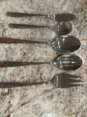 - This flatware set includes 12 x 5-piece place settings. 5-piece setting includes dinner fork, salad fork, soup spoon, teaspoon, and dinner knife. Serving pieces include serving spoon and fork, slotted spoon, butter knife, and sugar spoon.