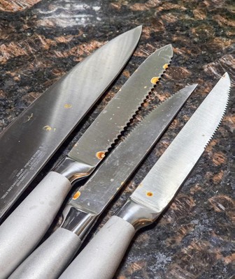 I purchased this knife set in July and within weeks several of the knives had small rust spots. We are now in November and the rust is so bad, I will have to purchase a new set of knives. I am so disappointed considering my $50 knife set lasted me 6 years, yet this $200 set didn't even last a few months.