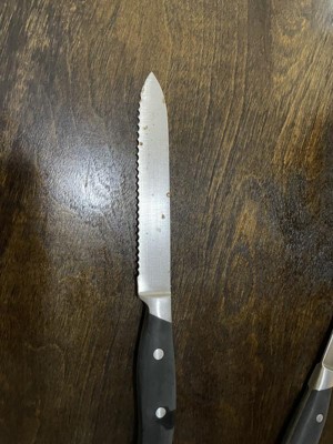 This is a quality knife set. I really like that the sharp, non-serrated knives have an automatic sharpener built into the block.