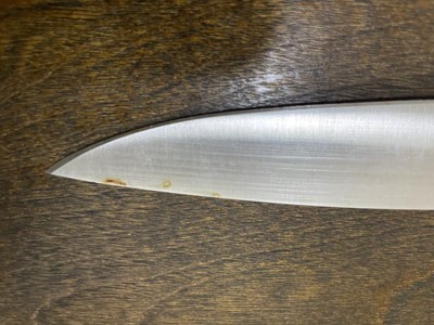 - Traditional triple-rivet handle offers balance and is curved for comfort