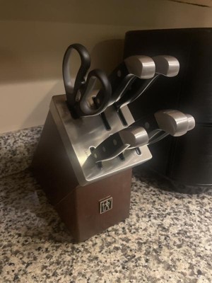 Equip your kitchen for less with these essential knives.The 7-piece knife block set features all the knives you need to set your kitchen up right. From the paring knife for smaller scale jobs to the chef’s knife for slicing and dicing, this set contain the key knives for all kitchen jobs, along with a sturdy set of kitchen shears. The set comes housed in a handsome, compact wood knife block. Honed for long-lasting sharpness, these fine-edge blades make fast work of kitchen prep.Since 1895, Henckels has been making high quality knives at an exceptional value. Solution knives are designed to tackle every kitchen task. Fabricated from high-quality stainless steel, the single-piece, precision-stamped knife blades are lightweight without sacrificing strength and durability.Curved for comfort, the break-proof, triple-rivet handles are pleasant to grip, giving you the control you need to slice through tougher cuts with ease. This ergonomic handle lets you enjoy maximum maneuverability and fatigue-free cutting.
