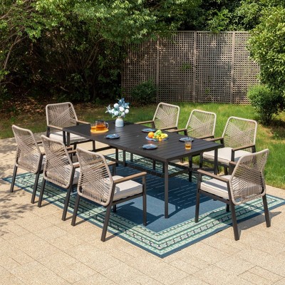 Includes: Seat Cushions, 1 Dining Table, 6 Arm Chairs