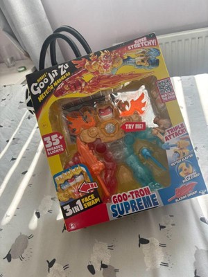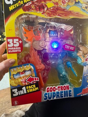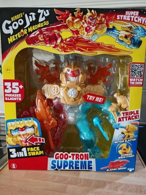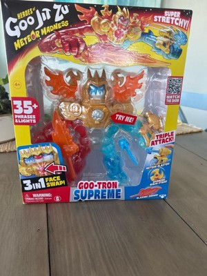 [This review was collected as part of a promotion.] Goo-Tron Supreme is a stretchy action figure with a shark-like head and gold armor, The figure features over 35 phrases and lights, and pressing its armor switches between different hero modes!