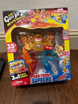 Stretched to the Extreme and coming straight for you! Brace yourself for a meteoric blitz with the all-new Heroes of Goo Jit Zu Meteor Madness: GooTron! Facing his greatest challenge yet, GooTron must unleash his incredible strength to stop Meteorax’s devastating meteor power before it wipes out the world. Kids can watch the goo crew battle to save the Goo-niverse in brand-new YouTube episodes, then recreate the action with this epic, stretchy hero. GooTron Supreme is the ultimate combination of Blazagon's fiery strength, Pantaro's stealth, and Thrash's raw power, proving that teamwork is the key to victory. Equipped with over 35 phrases and epic lights, this figure lets kids press his armor meteor to switch between heroes, selecting the character they want to lead into battle! Whether it’s Blazagon’s Blazing Sword, Pantaro’s spinning Ninja Stars, or Thrash’s Meteor Blaster, GooTron Supreme has the ultimate weapons to take down Meteorax and save the Goo-niverse. Beyond his triple-powered attacks, GooTron’s ability to stretch up to three times his size makes him a formidable hero, leaving no villain safe—no matter where they’re hiding! As kids stretch, twist, and squish GooTron in battle, they’ll reveal his three unique goo fillings, adding new ways to play. With his combination of the three most epic heroes, GooTron Supreme is ready for next-level battles, high-stretch excitement, and epic, gooey mayhem. Get ready for the all-new Meteor Madness: GooTron Supreme!