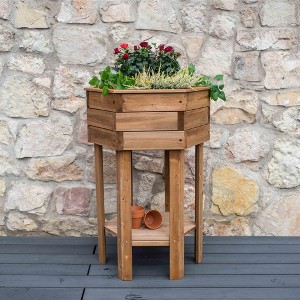 Enjoy gardening without the bending or back strain with this 38-inch tall Hexagonal Raised Garden Bed. Designed for comfort and durability, it’s made in Europe from FSC-certified pine and spruce wood and treated with natural linseed oil for long-lasting protection against rot and decay. The spacious, raised design makes it perfect for patios, decks, or small-space gardens, while the included textile liner and lower shelf make planting and storage easier than ever. Functional and stylish, it’s a beautiful addition to any outdoor space.