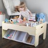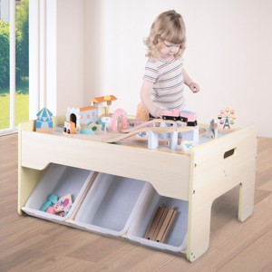- The illustrated ocean-themed play surface with an underwater scene makes a fun background for your child’s railroad town while the 3 removable storage bins offer hidden storage