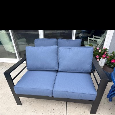 Heynemo Patio Furniture Aluminum Sofa, All-Weather Outdoor 3 Seats Couch, Black Metal Chair with Blue Cushions Set of 1