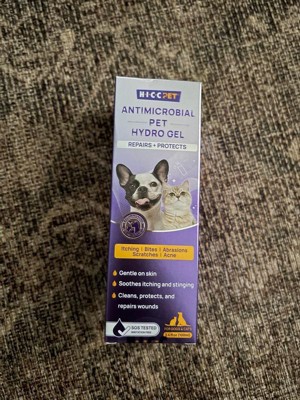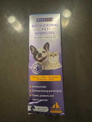 Repairs + Protects Recommended by Veterinarians Itching Bites Abrasions Scratches Acne Gentle on Skin Soothes Itching and Stinging Cleans, Protects, and Repairs Wounds SGS Tested Irritation Free HICC Pet® Antimicrobial Pet Hydro Gel is formulated to clean, protect and repair rashes, cuts, irritations, bites and burns. It is suitable for use on both dogs and cats and is safe if licked.