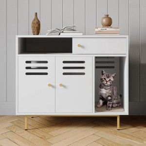 This 31.5"L x 19.7"W x 26.2"H white enclosure seamlessly blends pet functionality with home decor, featuring hidden storage and intelligent design for modern pet owners.